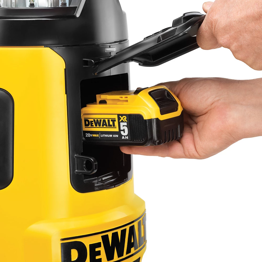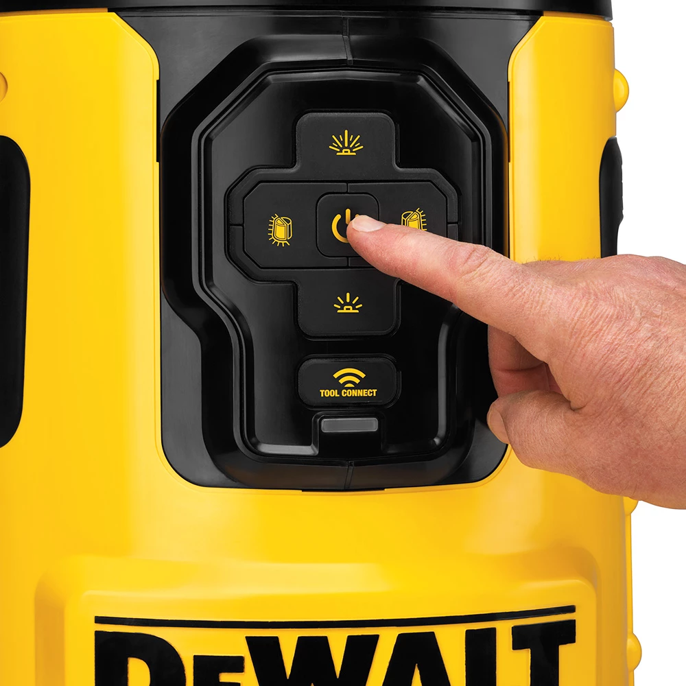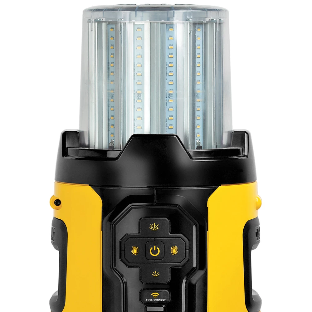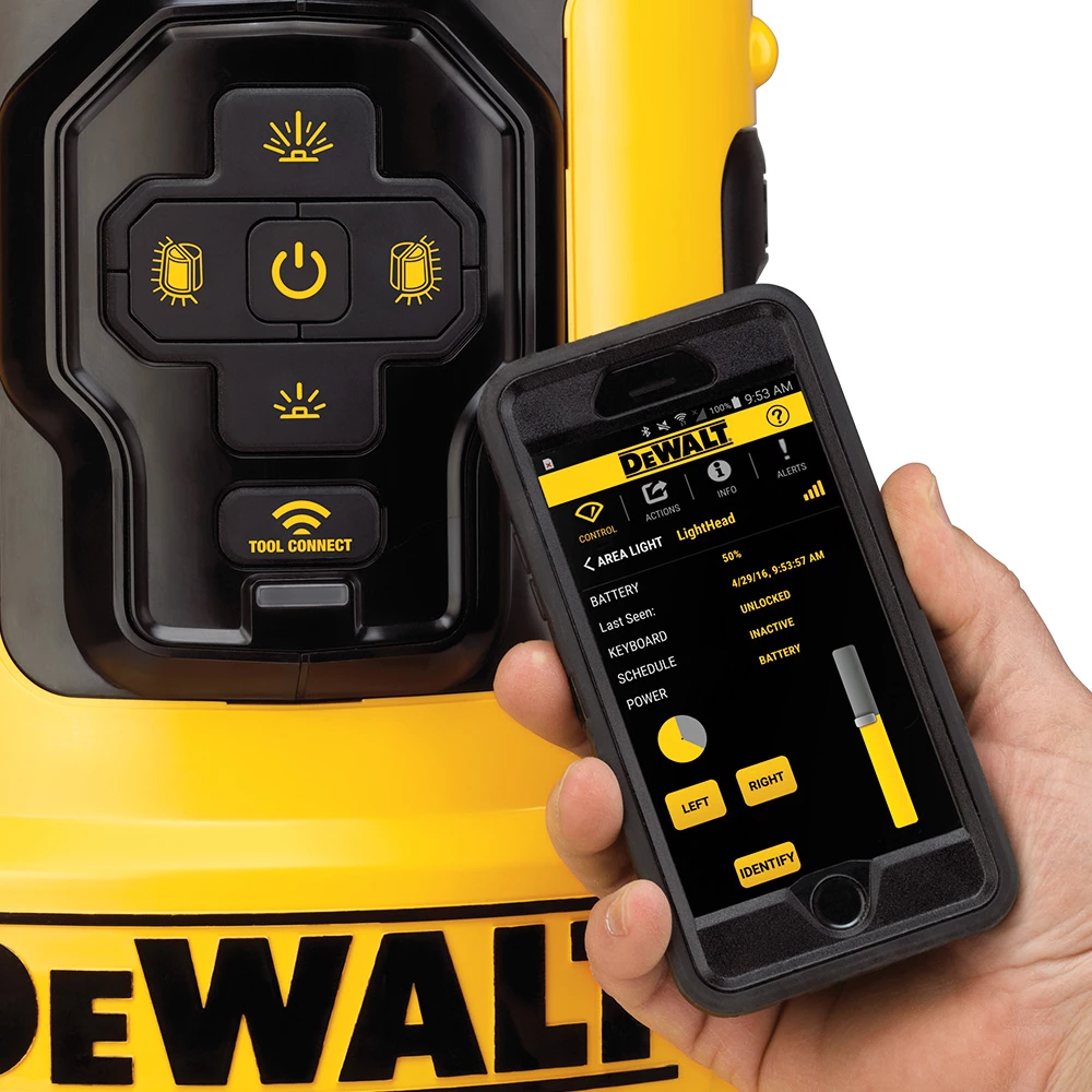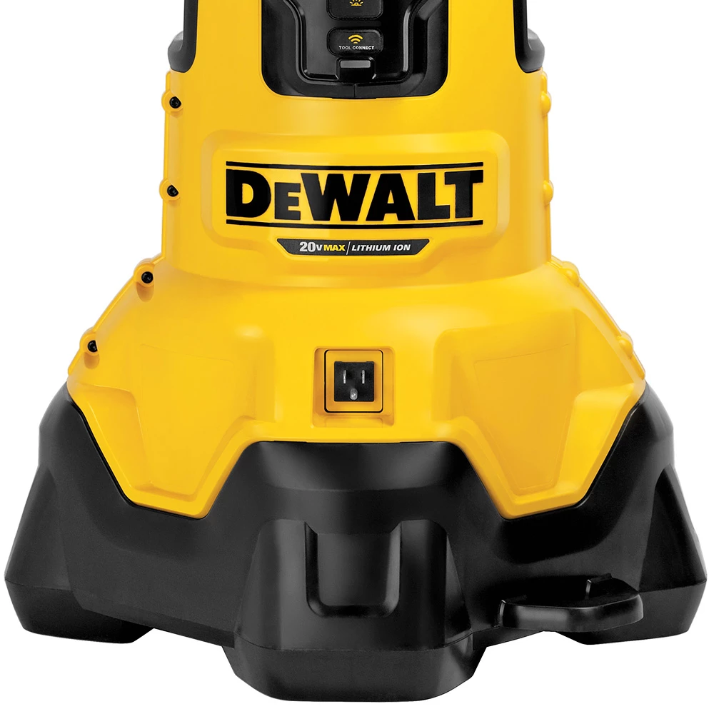 Dewalt DCL070. Features: LED MAX Lumens of 7,000. Stack lights for easy storage and convenience on the job. AC Outlets Provide flexibility and convenience to daisy chain lights or power for corded tool. On-board charger with door lock option. Stackable with wheel kit option. DeWALT Tool Connect ability to control light through your smart phone.