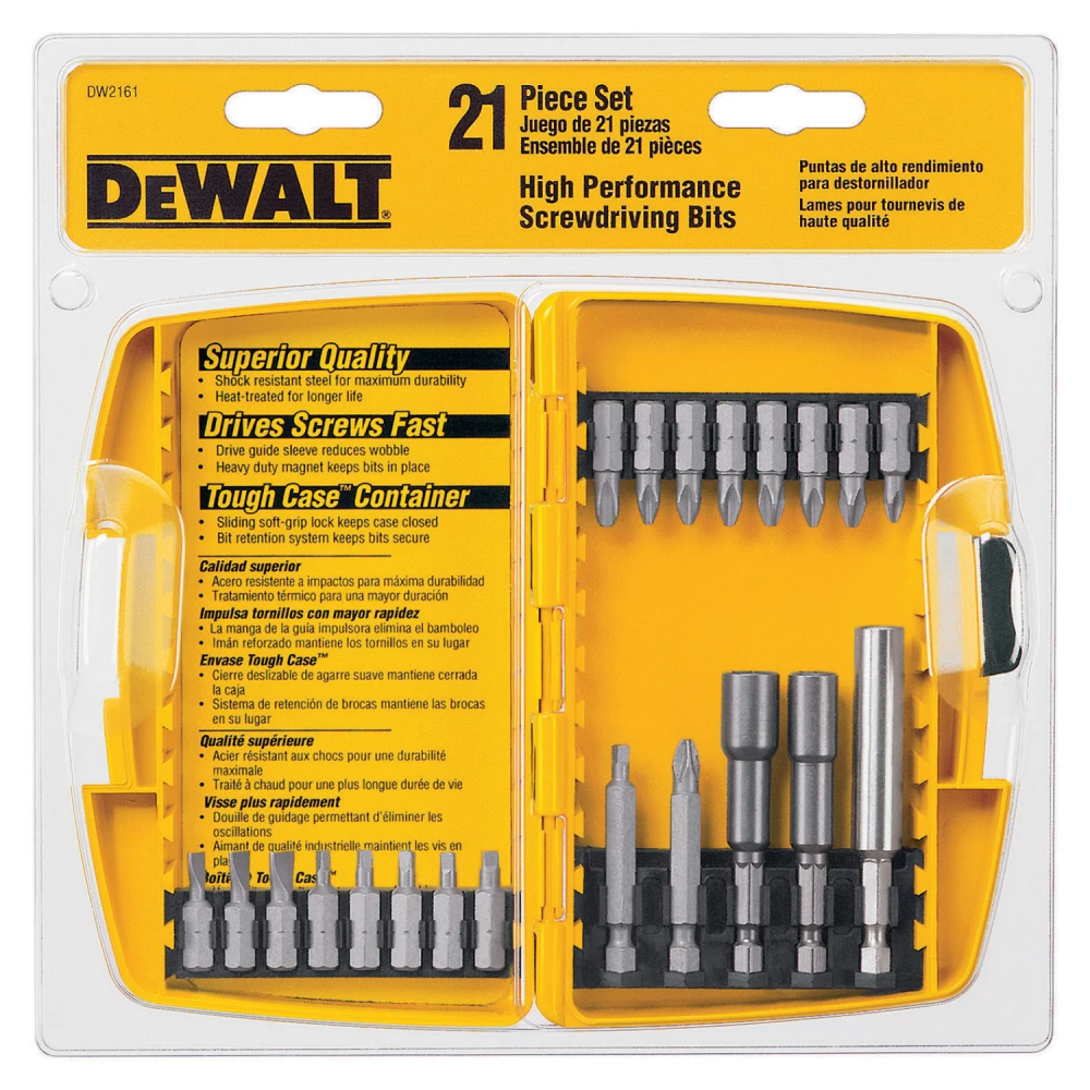 The strength and durability of heat-treated screw and nut driver bits make them a great choice for the demanding professional, and that dependability is exactly what you get in the DeWalt DW2161 21-piece set. The advanced hardening process used in the creation of these tools allows them to provide higher torque and improved driving power, so you get jobs done faster and more efficiently. And they come neatly packaged in a heavy-duty case made from industrial-grade ABS material, so you never end up sorting through the bottom of a big tool kit for a little bit tip. This durable case also offers an interlocking hinge and a sliding, rubber lock, so you can count on it to stay closed and hold up to the test of time.