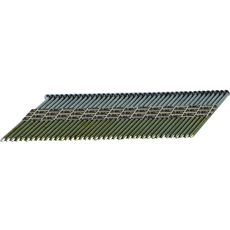 Brand Name: DeWalt, Length: 3-1/4 in., Fastener Type: Angled Strip, Product Type: Framing Nails, Angle: 30 deg., Shank: Smooth Shank, Number in Package: 2500 pk, Packaging Type: Boxed, Head: Offset Round Head, Point: Chisel Point, Finish: Bright, Diameter: 0.12 in., Material: Steel, Collation: Paper Tape.
