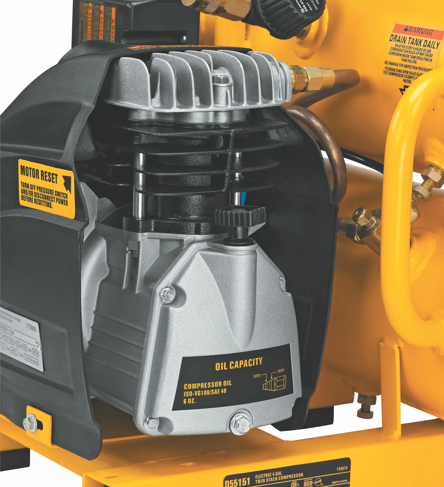 The DEWALT D55151 hot dog compressor has all the power of a large compressor, but constructed as a smaller, lighter unit. It delivers 3.2 cubic feet per minute at 100 PSI and is durably built with oil-lubricated cast-iron cylinder. Included with the hot dog compressor are a 2/8 in. regulator and an initial fill of DEWALT synthetic air compressor oil.