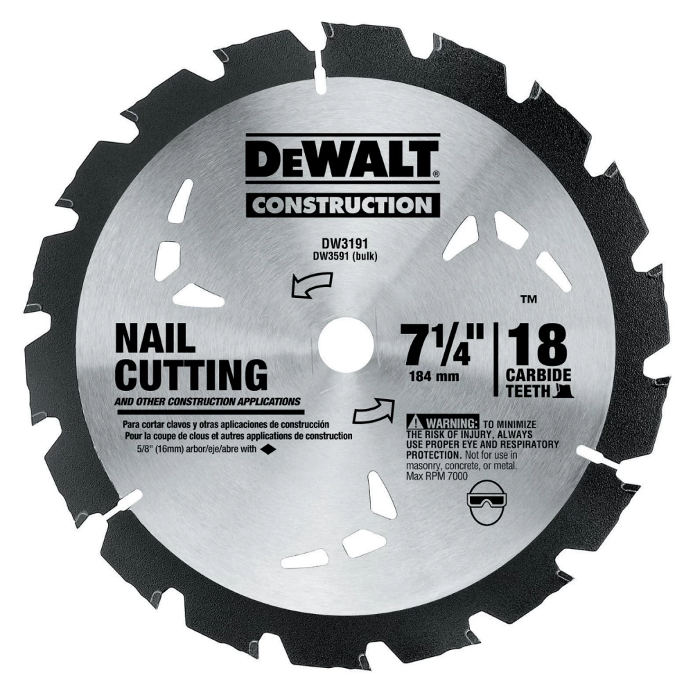 DEWALT® designed the series 20 7-1/4 In. 18T nail cutting circular saw blade to provide top quality performance throughout its long life. Rock carbide teeth maximize resistance and extend the lifespan of this blade. This blade brings maximum durability because its flush ground teeth and reinforced shoulder have been tested to ensure they meet the highest standards. DEWALT® blades feature a 5/8 In. arbor with diamond knock-out for compatibility and accuracy. With an anti-stick rim, time-consuming problems caused by friction and gum-up are minimized so you can maximize productivity.