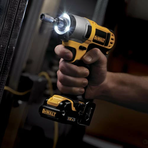 Dewalt DCF815S2. Features: Compact and lightweight design; weighs only 2.3 lbs. and can fit into tight areas. Three LED lights provide visibility without shadows. One-handed loading 1/4 in. hex chuck that accepts 1 in. tips. Belt hook included for portability. Rubber bumpers allow tool to be laid down without marring surfaces. Forty minute charge time. Includes two 12V MAX 1.5 Ah Lithium-Ion Batteries.