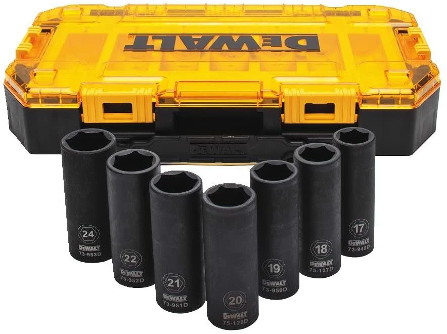 The 7 Piece Deep Impact Socket Set 1/2 Drive offers a variety of impact sockets for any user need. The metric sockets set comes in a lockable stacking case for easy storage.