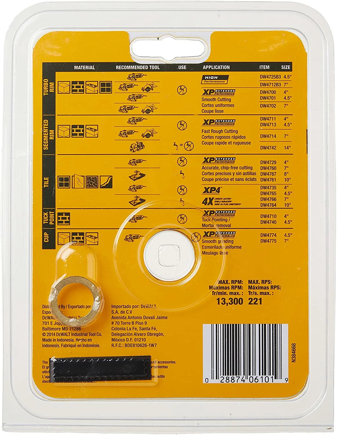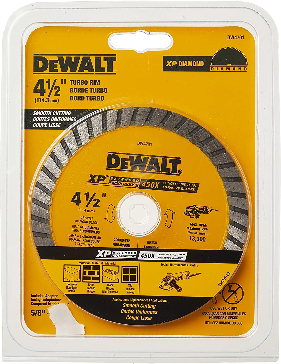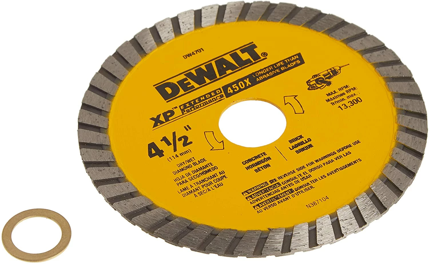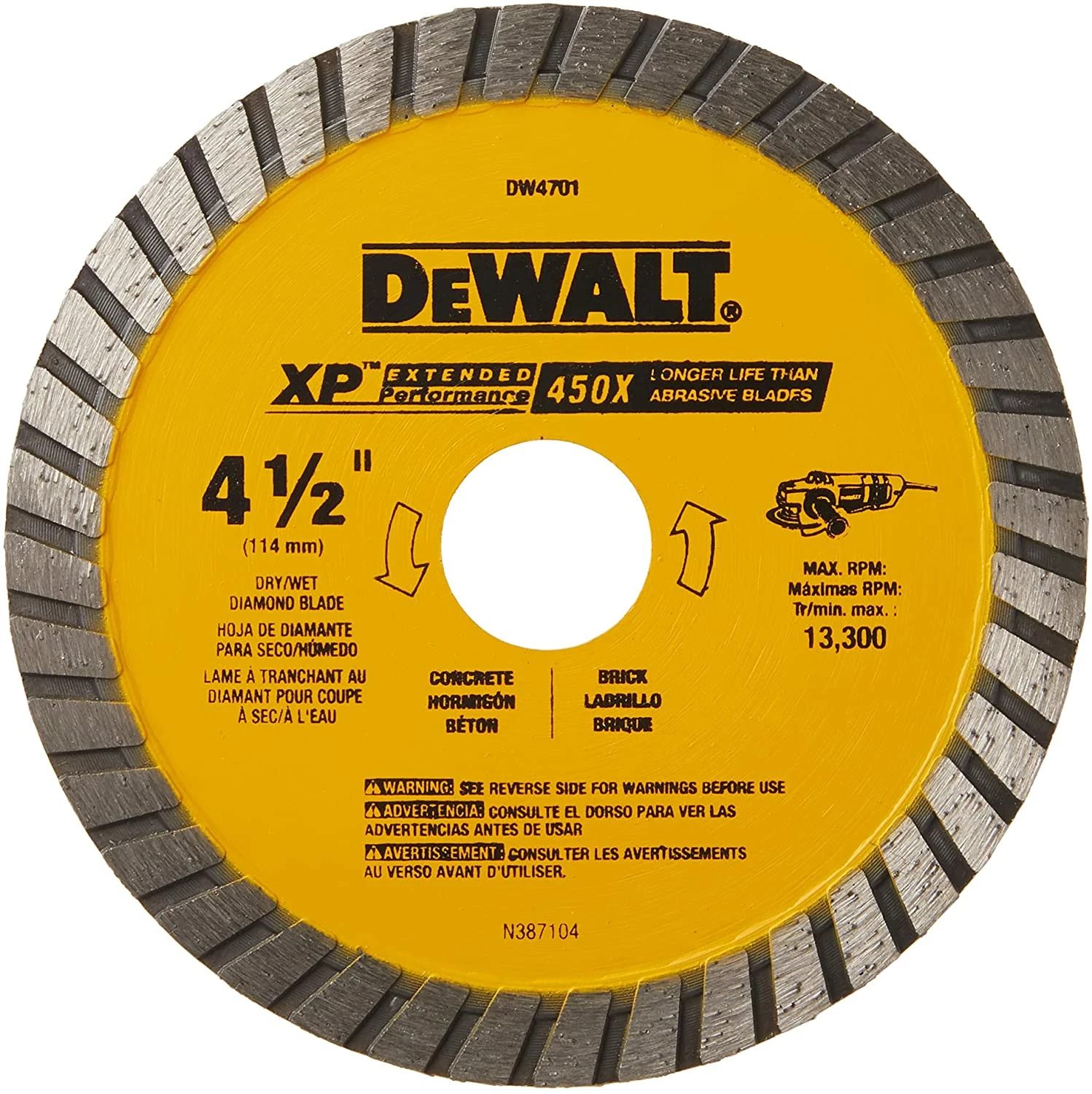 The DEWALT DW4701 is a great addition to your 4-to-4-1/2-inch grinders. With an advanced diamond matrix, this blade provides a longer life and improved grinder application. It’s designed for consistency, with a straight and dependable depth of cut and a greater life span by 100 times more than the industry standard. Use this blade on a variety of tough applications, including concrete, stone, granite, brick, and tile. It measures 4-1/2-inches in diameter with a 5/8-inch and 7/8-imch arbor. This grinder accessory must be used with the DW4705 4-inch or 4-1/2-inch guard with show and the DW4717 4-inch flange or DW4706 4-1/2-inch flange.
