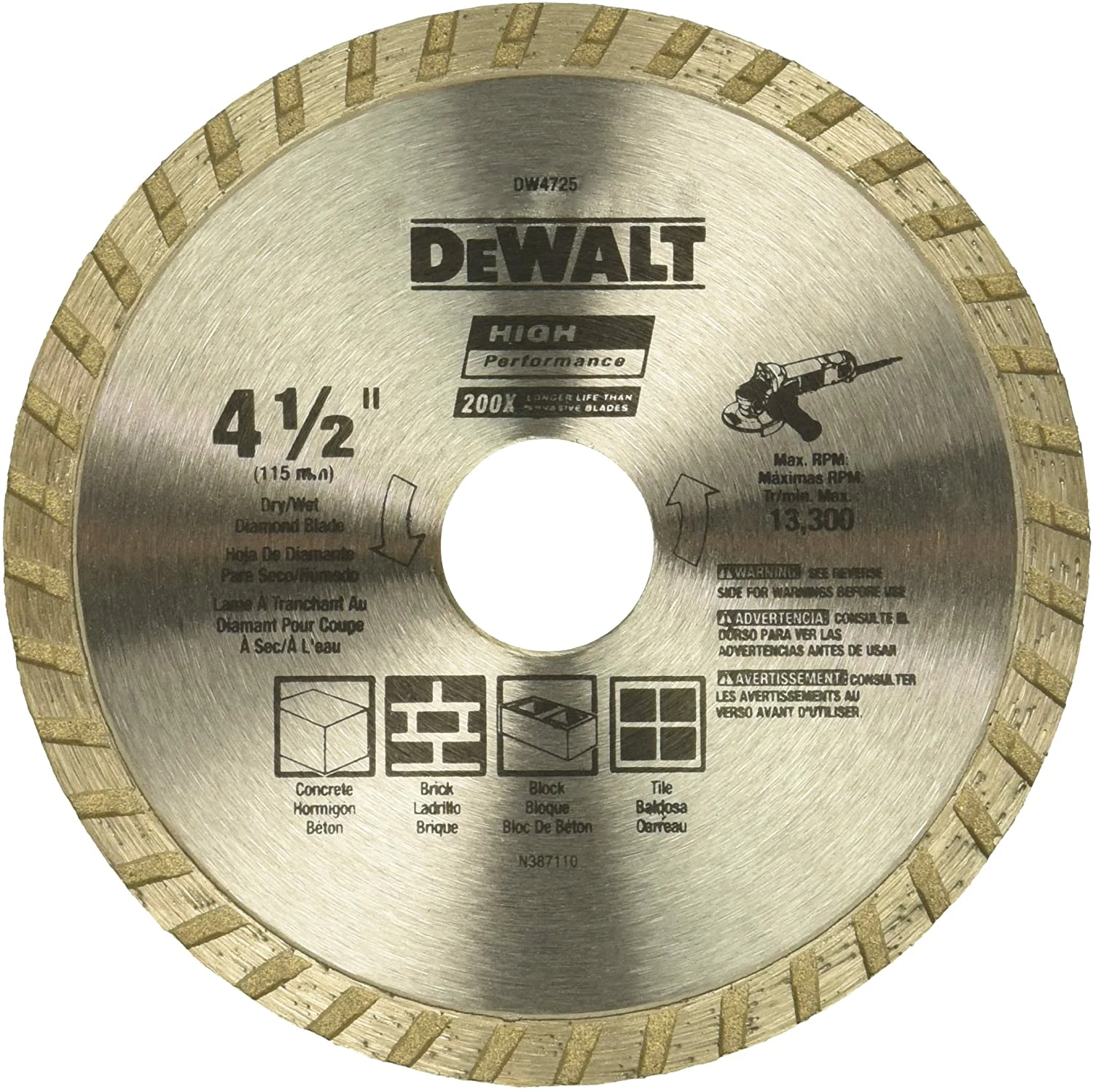 DeWalt’s 4-1/2-Inch High Performance Masonry Diamond Blade provides long life and enhanced material removal. It has a thinner kerf to increase speed of cut while minimizing dust, and achieves 30 times longer life than bonded abrasives. This blade is best for cutting block, masonry siding products, and other masonry materials. It offers a faster cut rate at a constant depth, which is ideal for thinner and softer masonry materials.