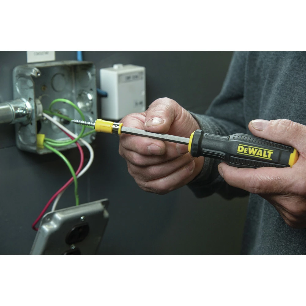 Dewalt DWHT62058. Features: Bi-material ergonomic quad-lobe handle design for comfort and maximum tip torque. Max Fit tip design for maximum fit in fasteners and elimination of stripped screws. CNC machined tips ensure consistency for fitment and life. Tool-grade S2 steel bar and tips for high strength and durability. Hex bar for additional leverage when used with a wrench. Magnetic screw lock system prevents fastener and screw wobble. Yellow torsion zone flexes to reduce cam-out.