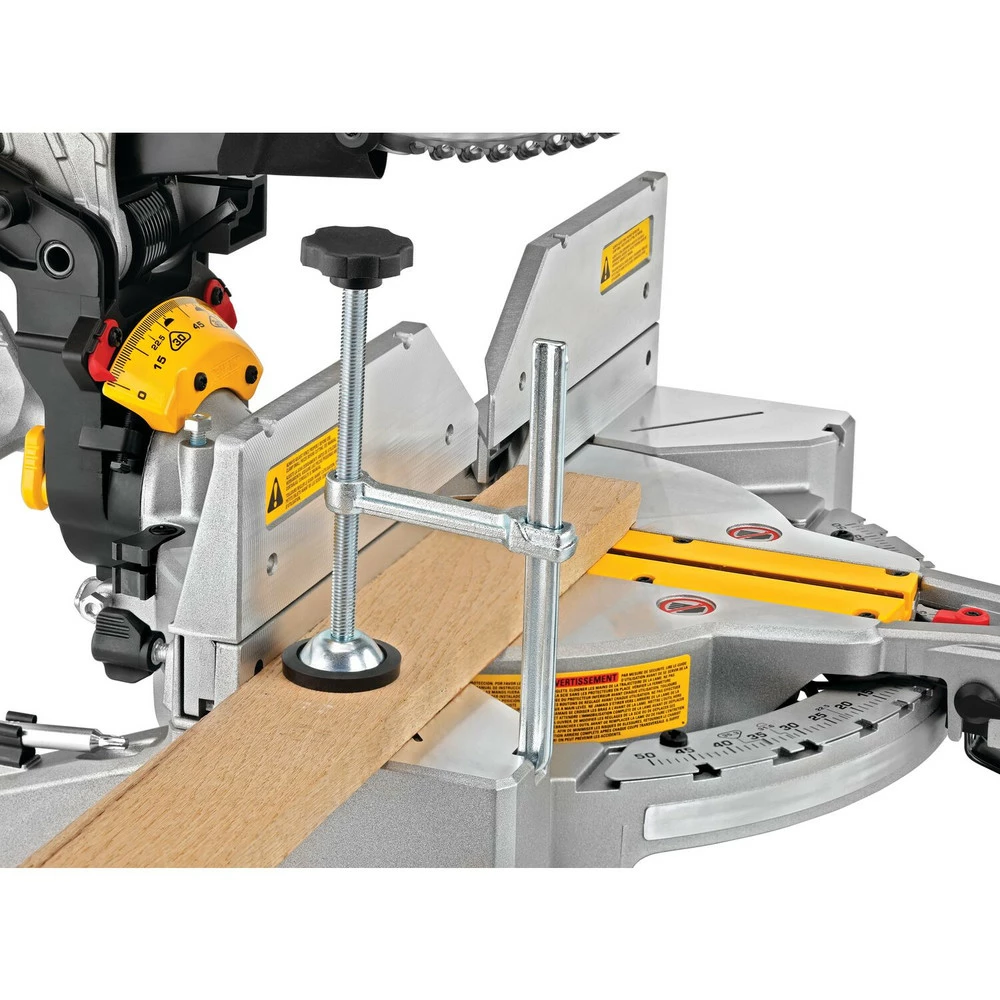 - The 12 in. Double-Bevel Compound Miter Saw is powered by a 15 Amp motor that drives 3800 RPM to deliver extended power and durability. This saw features a stainless-steel miter detent plate with 14 positive stops and cam miter lock system that provides repeatable accuracy and durability with easy adjustments. Tall sliding fences support 6-1/2 in. of base molding vertically and 6-5/8 in. of crown molding vertically nested. High-efficiency dust duct is concentrated at the point of cut for maximum collection. The lightweight design and built-in carry handle provide portability.
