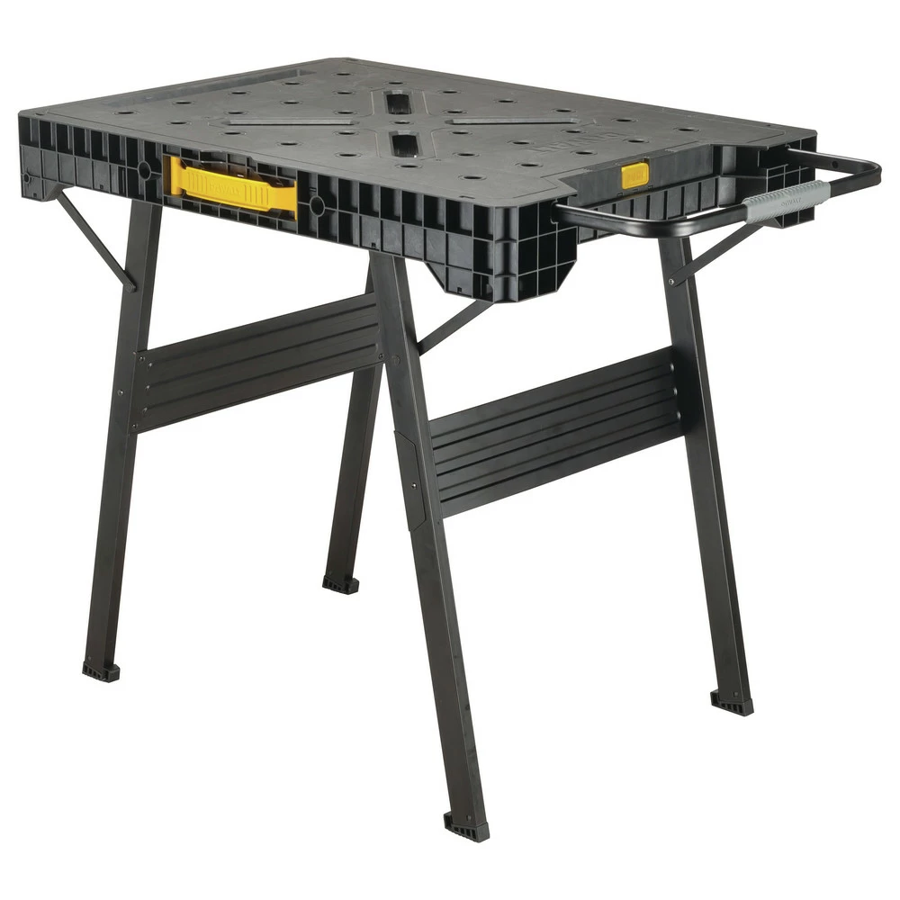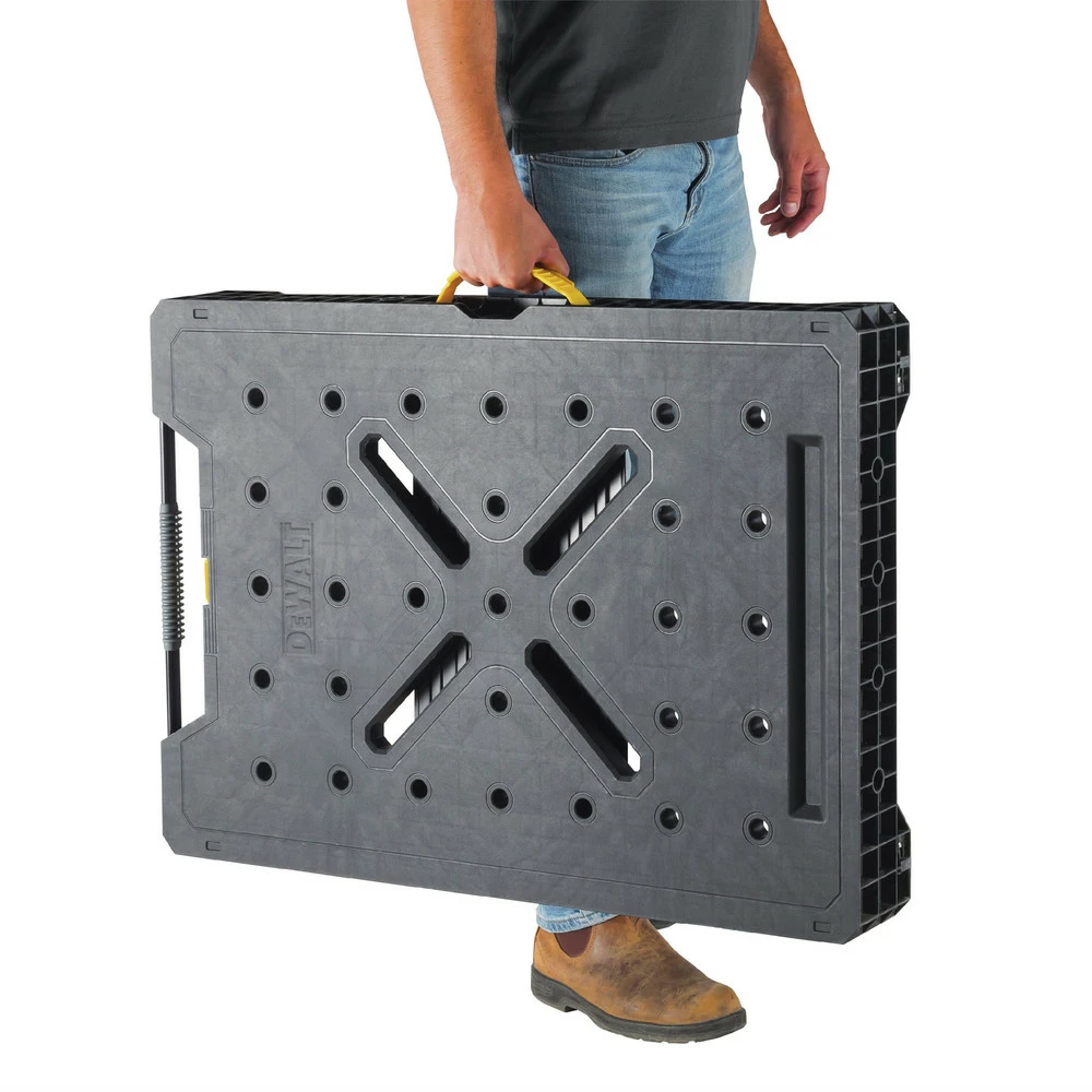 Dewalt DWST11556. Features: Versatile clamping – compatible with trigger clamps, allowing to carry out all clamping applications. Quick setup and folding – less than 3 seconds. Metal legs support up to 1000 lbs.. Large work surface enables various user applications. Opening handle can be use as tool hanger. Folding product allows compact storage.