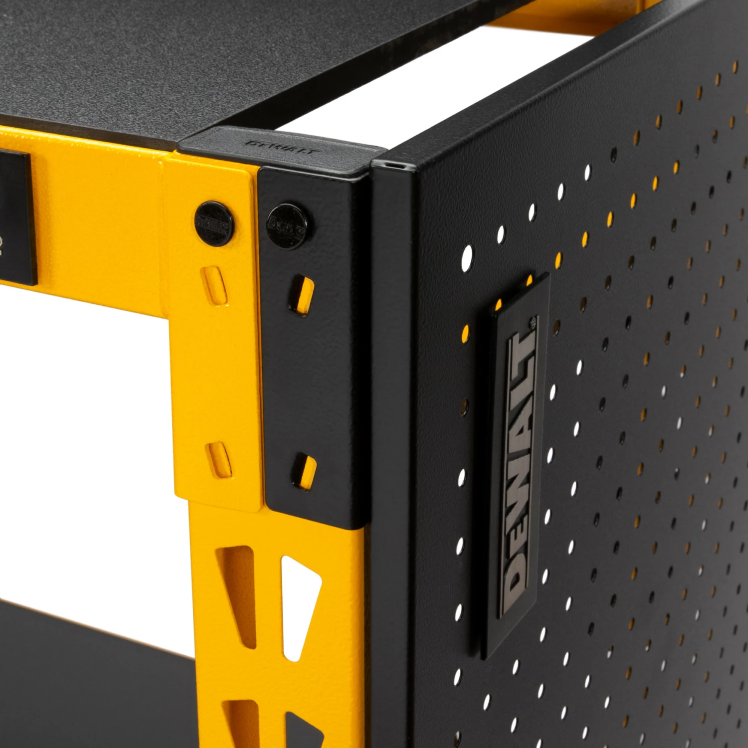 Expand the storage capacity of your existing DEWALT storage rack with the DXSTA4500PBK 2-Piece Pegboard Kit. Made to match the dimensions of the DXST4500 4-foot storage rack, it shares some of the same innovative features and adds a few of its own. Each 18-inch x 44-inch panel is made of durable steel which is then given an industrial grade black powder-coating that matches the appearance and texture of the existing laminate wood composite decking on the 4-foot storage rack. The pegboard kit contains two sets of mounting brackets to let you attach the panels to sides or back of the rack in one of several configurations. You can use them either with one panel mounted on each side, with both panels stacked vertically and attached to the back, or with one on a side and one on the back. To keep the panels in place once attached, they use the same locking pins as the racks to secure the mounts to the rack uprights and prevent them being knocked loose by accidental impacts. The panels feature standard 1-inch on center hole spacing with 1/4-inch diameter holes to fit most pegboard accessories. Thanks to their steel construction the panels let you use a variety of magnetic storage accessories as well, accessories that won’t work with regular wood and resin composite pegboards.