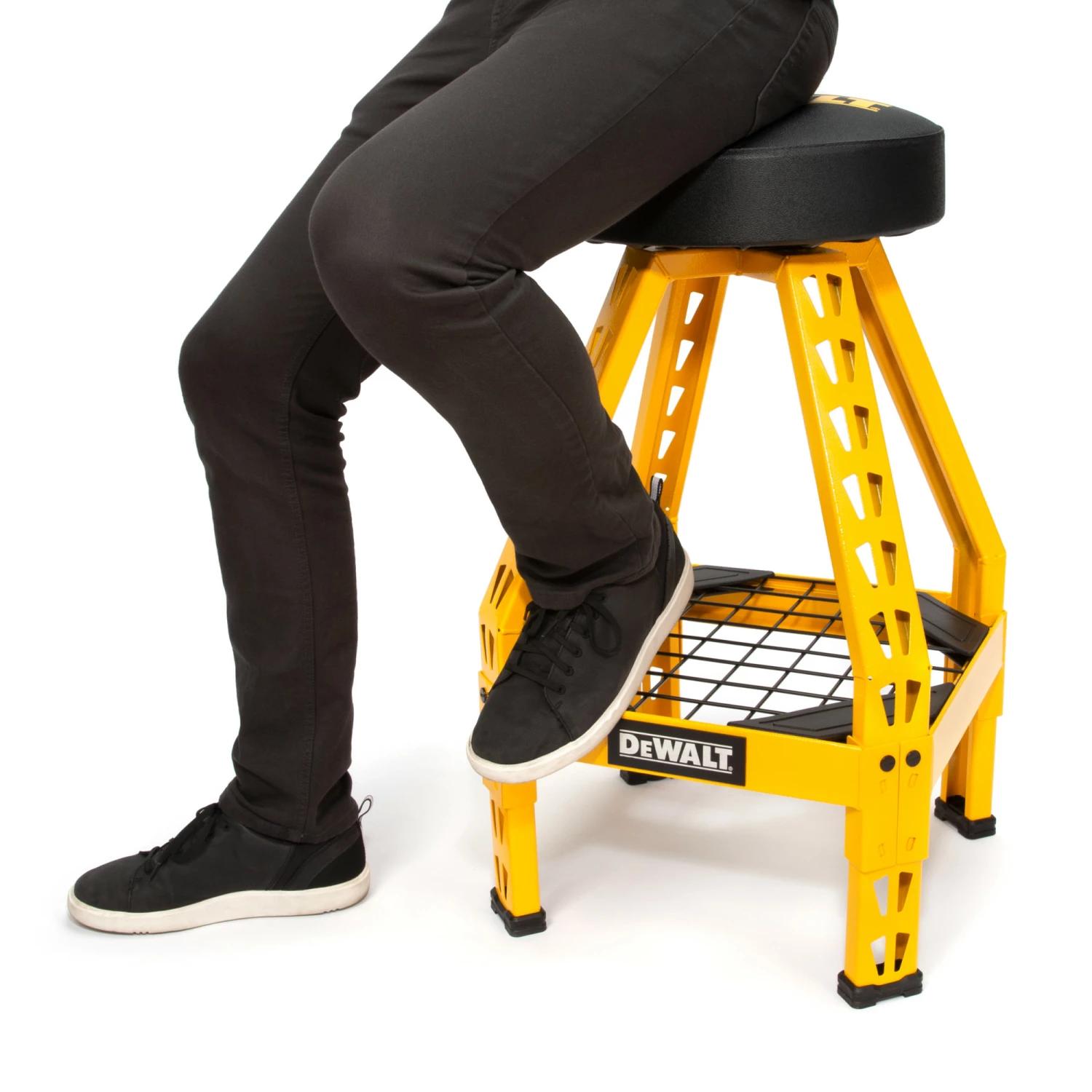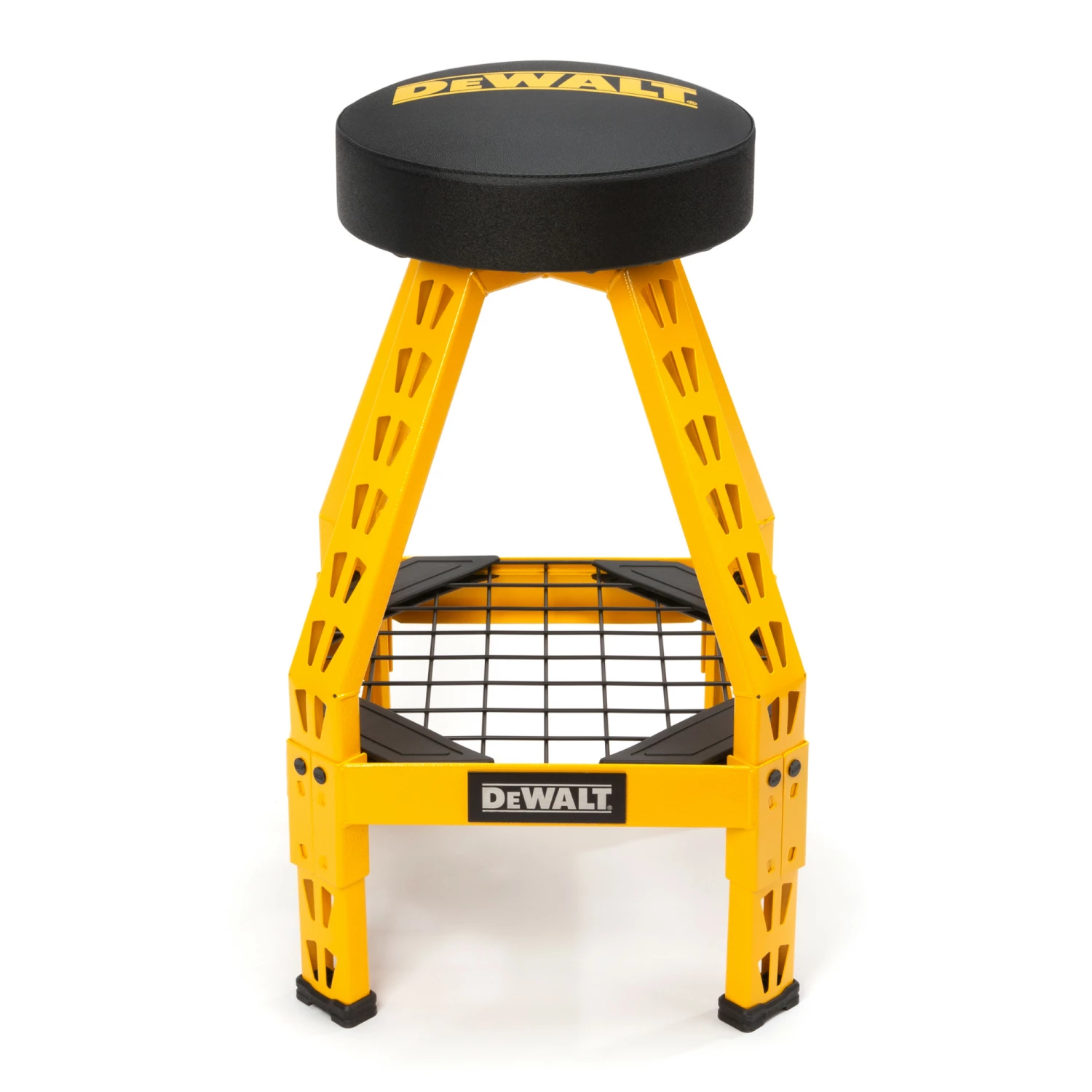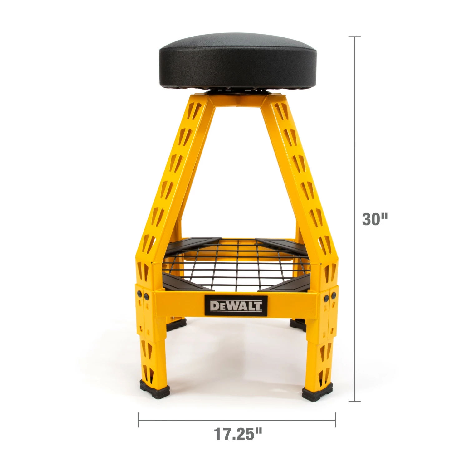 The DEWALT DXSTFH030 was designed and engineered to provide a heavy-duty stool fit for both professional and home use. This stool’s legs and supports are built using the same powder-coated, industrial grade steel uprights and crossbeams as our 4-foot storage rack. The comfortable foam-padded seat sits atop a 360-degree swivel allowing free and easy rotation when seated and the textured vinyl cover resists rips and tears. A bracket-secured industrial wire grid lower shelf provides an ideal place to store necessary tools and supplies. Featuring an all steel frame construction this stool can easily hold up to 300 pounds without showing any signs of weakening or metal fatigue. This stool features a version of the rugged, glass-filled nylon feet used on the storage racks that has an adjustable levelling pad as part of the foot. Made of the same reinforced nylon material these levelling feet can be easily adjusted by hand to eliminate any wobbling of the stool in addition to preventing damage to flooring. The bolt-secured frame comes pre-assembled with only the seat needing to be attached before the stool is ready for use.