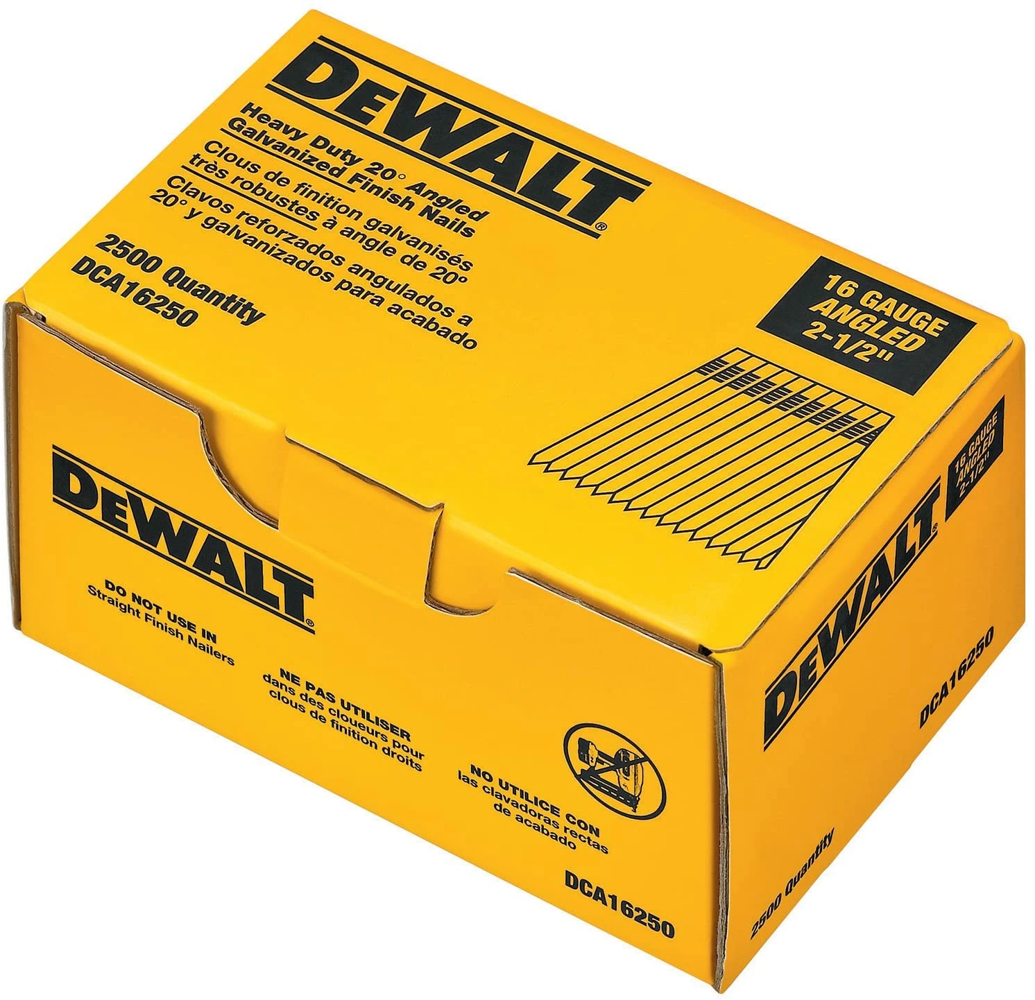 This pack of 2,500 DeWalt DCA16250 2-1/2-inch, 16-gauge, 20-degree Finish Nails are galvanized to resist moisture and rust. Ideal for finish work, these nails are designed to work with all DeWalt cordless angled nailers.