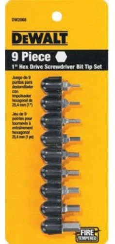 DEWALT bit tip inserts are make fro shock-resistant tool steel for maximum durability and longevity. The advanced hardening process provides maximum durability. For use in bit tip holders for driving screws in a variety of materials. Set Includes: 5/64-Inch, 3/32-Inch, 7/64-Inch, 1/16-Inch, 1/8-Inch, 9/64-Inch, 5/32-Inch, 3/16-Inch and 1/4-Inch hex bits.