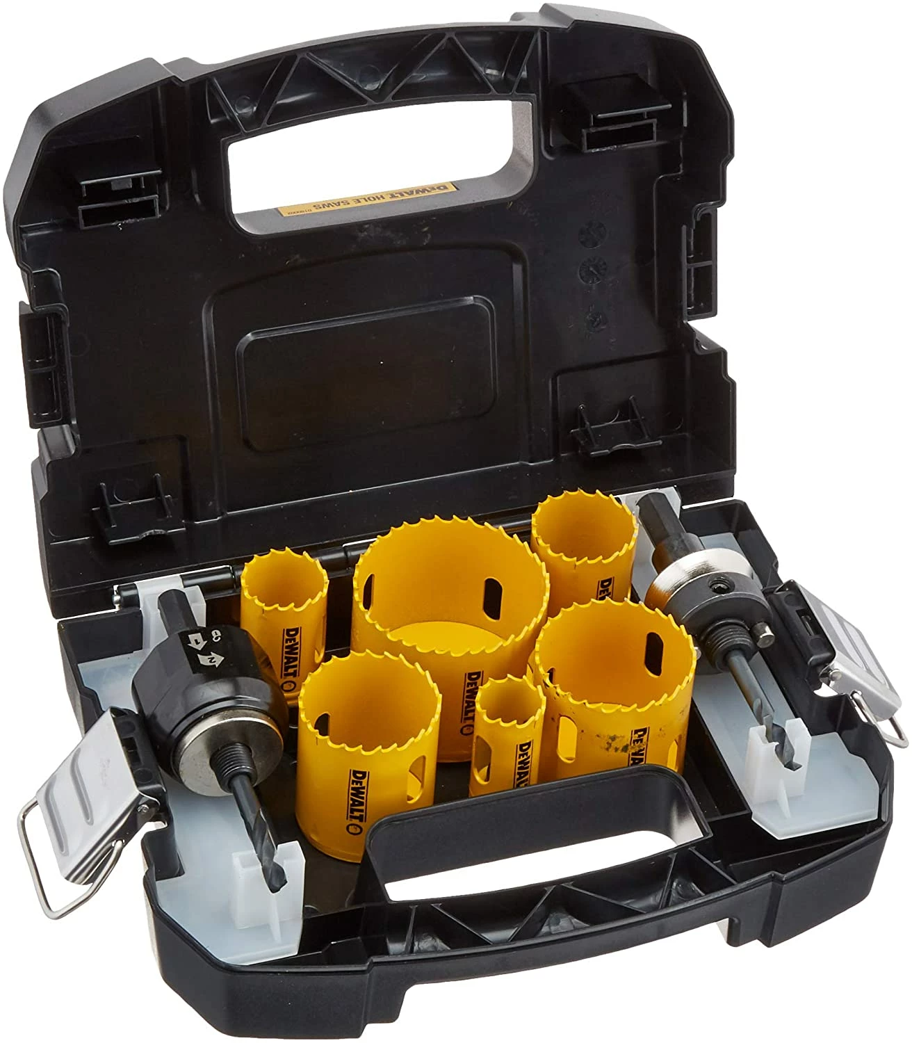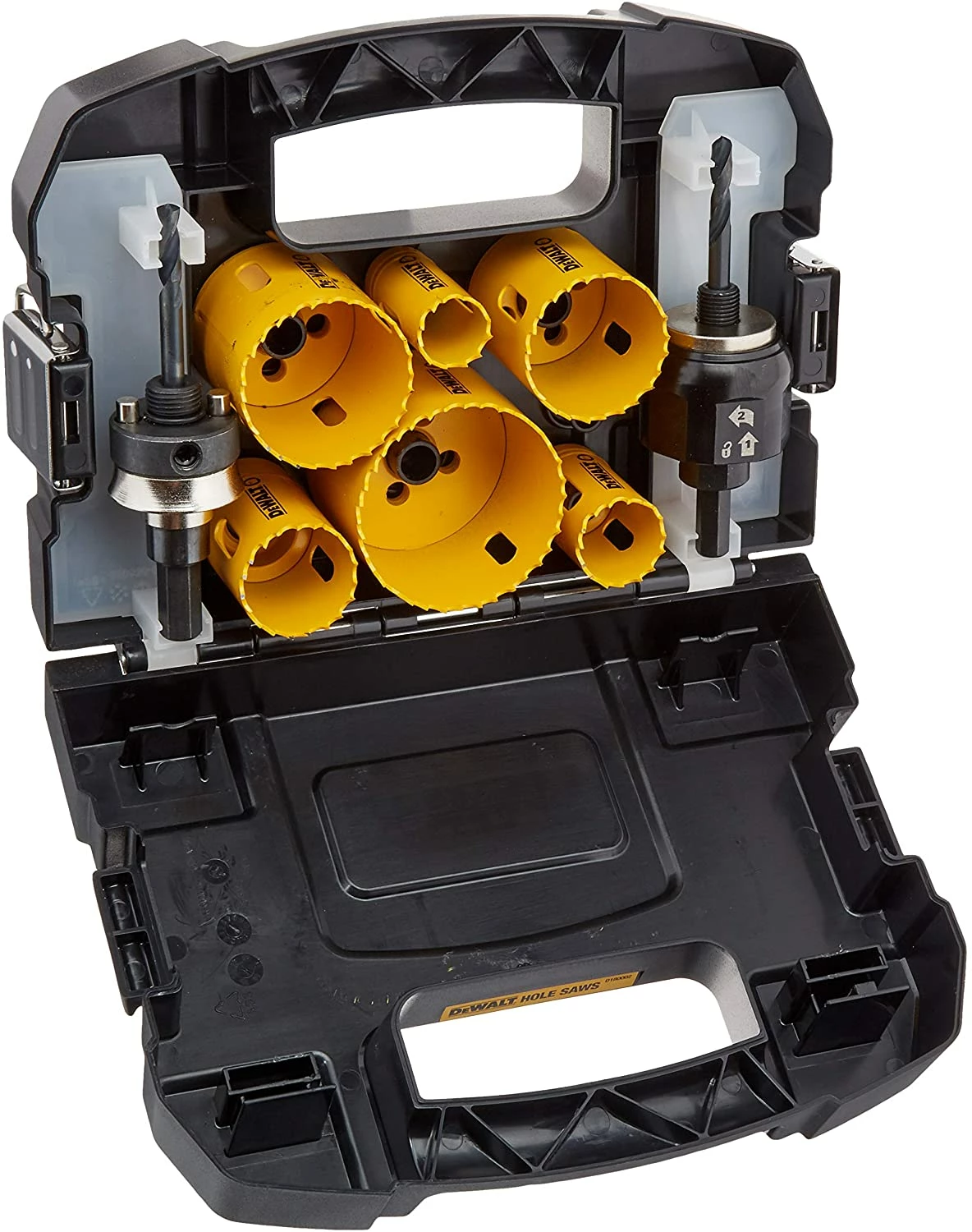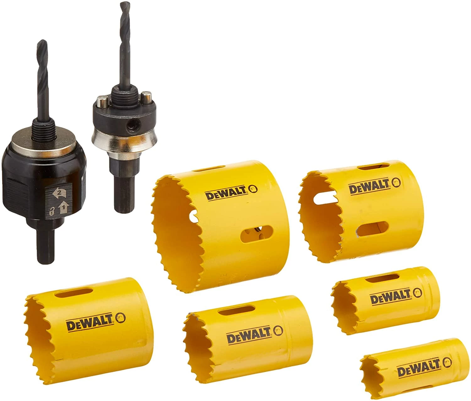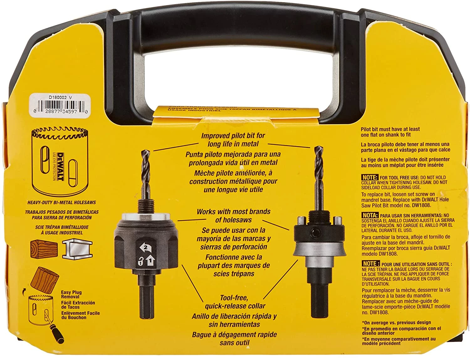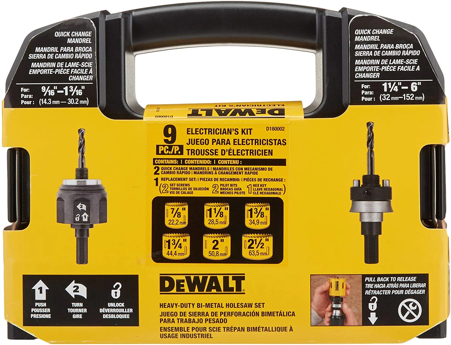 Get the results you need at 35-percent longer life than the industry leader and 200-percent longer than the industry standard with the DEWALT D180002 bi-metal hole saw kit. You can expect superior results with the innovative tooth and set guide and the broad, toughened backing plates that avoid marring around the bores. This innovative holesaw kit utilizes a deep-cut technique, which broadens functionality by increasing the variety of widths the saw is compatible with. It also features an enlarged bi-metal section, which is crafted from M3 steel for added protection against jobsite abuse. Packed in the kit are: 7/8-, 1-1/8-, 1-3/8-, 1-3/4-, 2-, 2-1/2-inch holesaws, two mandrels, stainless steel mug, and a rugged kit box.