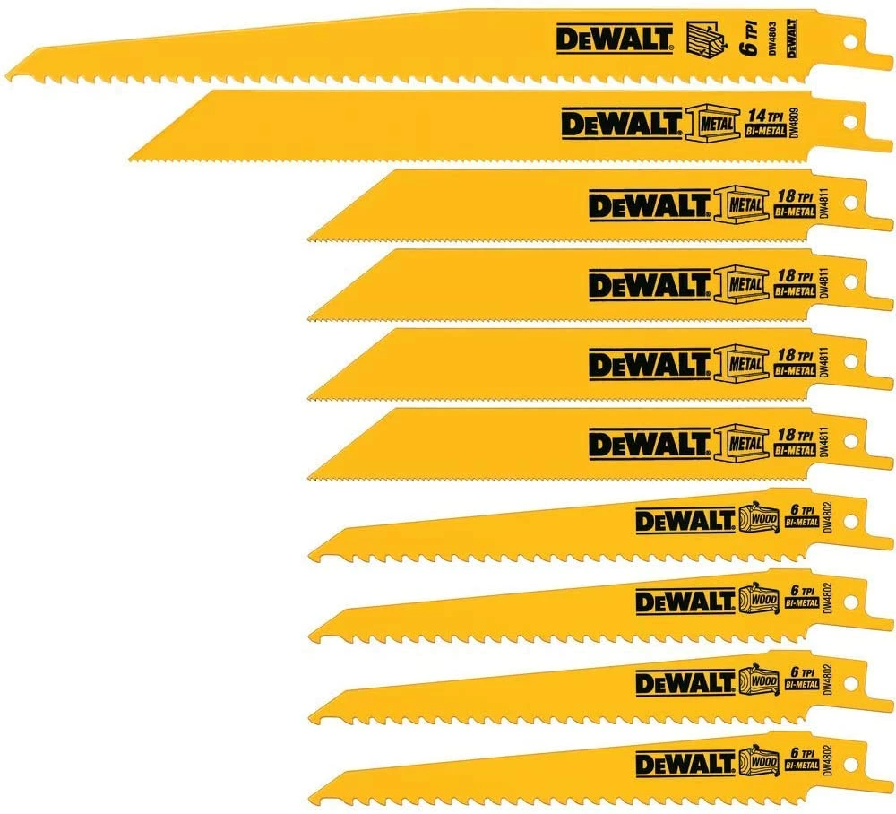 The DEWALT DW4898 10 Piece Bi-Metal Reciprocating Saw Blade Set with Case is a convenient set of reciprocating saw blade for your wood and metal cutting needs. This set includes: 4X DW4802 6-Inch 6 TPI Taper Back Bi-Metal Reciprocating Blade for General Purpose Wood Cutting, 4X DW4811 6-Inch 18 TPI Straight Back Bi-Metal Reciprocating Blade for heavy metal cutting, 1X 8-Inch 14 TPI Straight Back Bi-Metal Reciprocating Blade for metal cutting, and 1X 9-Inch 6 TPI Taper Back Bi-Metal Reciprocating Blade for General Purpose Wood Cutting. These blades come in an adjustable size Tough Case that is designed to fit in you kit box or storage bag for easy convenient storage.