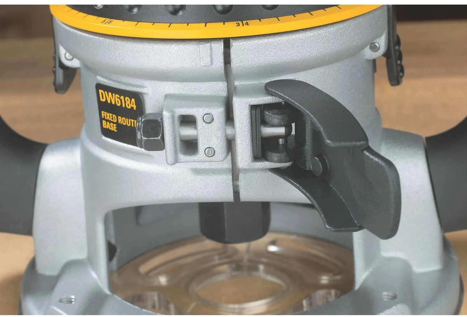 Featuring a 12.0-amp motor that delivers variable speed performance from 8,000 to 24,000 RPM, the DeWalt DW618 2-1/4-HP fixed-base router offers all the power and versatility that professionals demand. Soft start provides an extra-smooth finish and helps ensure that this tool even performs well when working with the toughest hardwoods. With a micro-fine depth adjustment ring, you can count on accurate adjustment in 1/64-inch increments, while a clear, Lexan sub-base ensures durability and visibility. The included sub-base concentricity gauge enhances accuracy even further by helping you maintain bit concentricity, and long, eight-slot collets that are self-releasing provide excellent bit retention for dependability. A steel motor cam lock and quick-release motor latches make adjustments and base changes tool-free, fast, and easy when you need to switch tasks, and a unique, detachable cordset helps keep this tool easy to service. This router also provides over-molded, rubber handles and a well-balanced body for increased operator comfort and control. The unique switch and cordset configuration allows you to keep the switch in your right or left hand, while a flat top and spindle lock further increase the ease of bit and depth changes. The switch is also dust-sealed for durability. Kit includes motor pack, DW6184 fixed base, 1/4-inch and 1/2-inch collets, wrench.