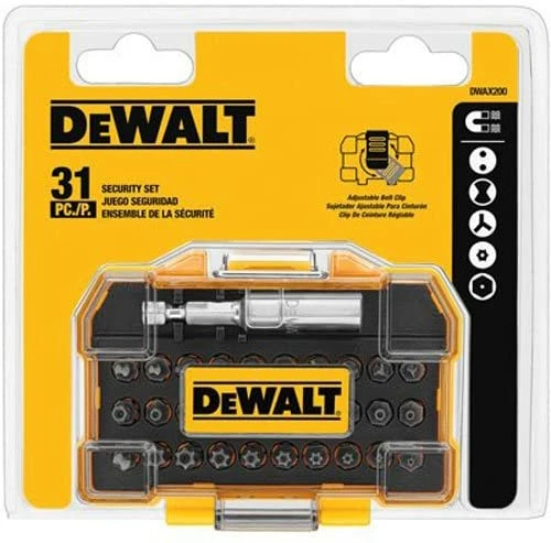 DEWALT DWAX200 31pc Security Screwdriving Set. This set is specifically designed with security bits for tamperproof screws. The case includes an adjustable belt clip for handy access and portability. Set includes: (9) Security Star Bits: T8, T10, T15, T20, T25, T27, T30, T35, T40. (6) Security Hex Bits: 5/16-Inch, 3/32-Inch, 7/64-Inch, 1/8-Inch, 9/64-Inch, 5/32-Inch. (4) Security Hex – Metric: 2mm, 2.5mm, 3mm, 4mm. (4) Spanner Bits: 4, 6, 8, 10. (4) Tri-Wing: 1, 2, 3, 4. (3) Clutch Type G: 6, 8, 10. (1) Bit Tip Holder.