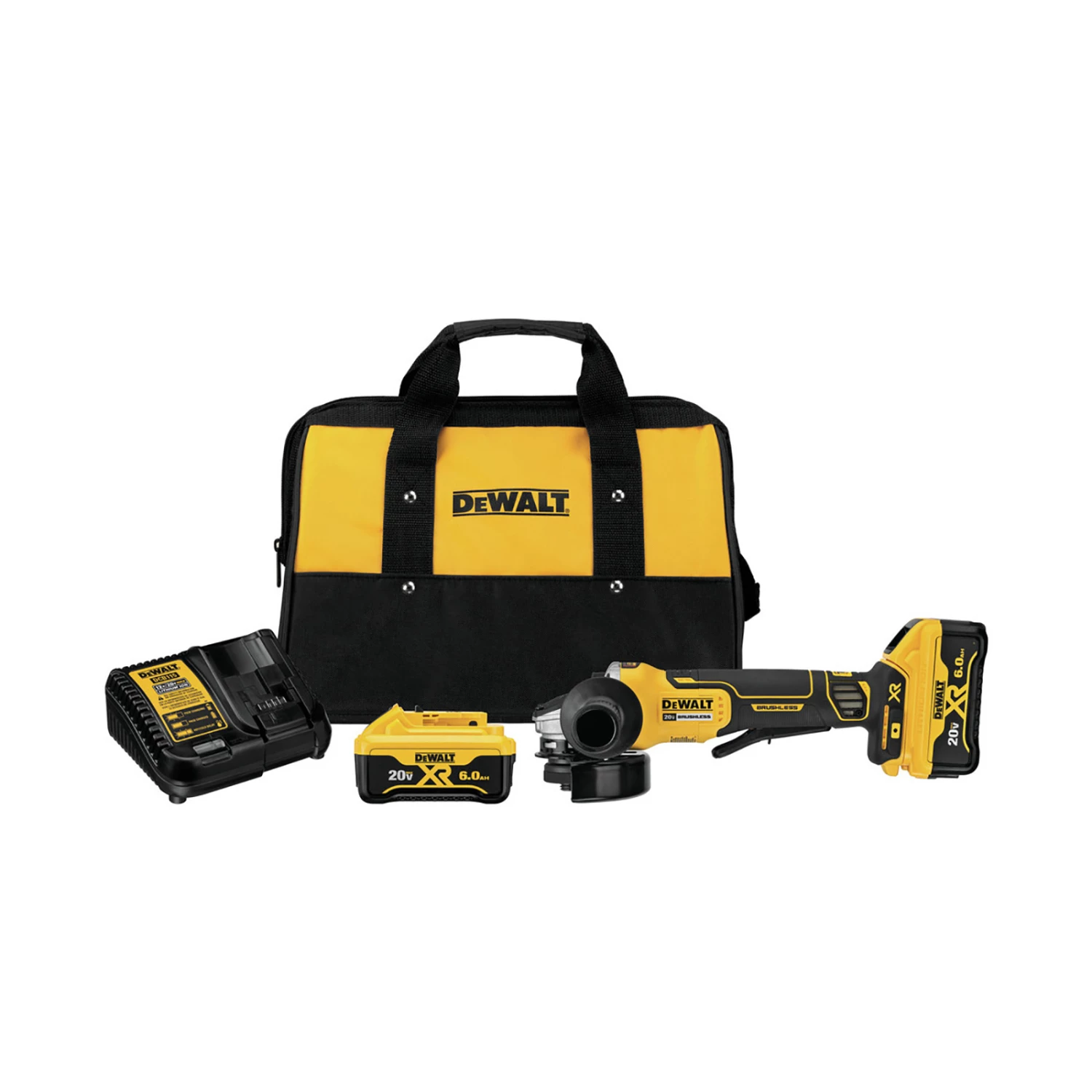 - Includes 1 grinder, 1 side handle, 1 hex key, 1 inner and outer flange, one 4.5″ type-27 guard, two 6Ah DCB206 batteries, 1 charger DCB115 and 1 kit bag
